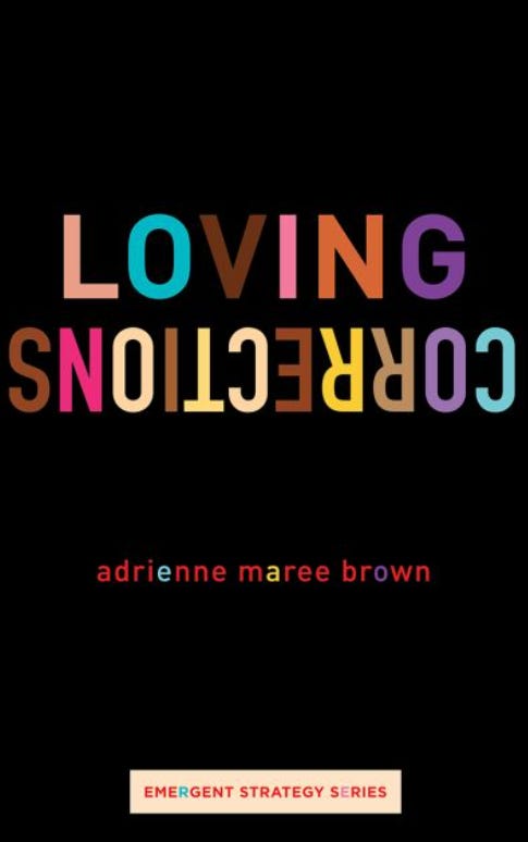 I’ve been very slowly working through “Loving Corrections” by adrienne marie brown. Not slowly because it isn’t interesting, but because I read each piece (short essays essentially serving as nudges to advocates on better ways of changemaking/being in community with each other) and then need to sit on it. This is a book for stewing, chewing, and digesting.