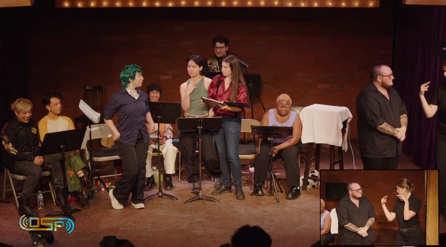 Next up was the short play incubator, an amazing collection of short plays from new Playwrites. These shows were unbelievable, so hilarious, so special, and deeply, deeply trans. I particularly enjoyed seeing trans art without any ham-fisted need to make our stories palatable, add in definitions, or help people make sense of our experiences. We made this to make sense of ourselves!